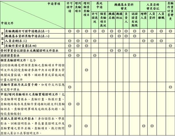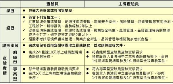 依據「溫室氣體認證機構及查驗機構管理辦法」第8條之規定,「申請查驗機構許可證者,應於申請之查驗類別下置二名以上查證人員,其中一名為全職主導查驗員」。同時,查驗機構設置之查證人員應符合第8條第2項之規定(見表1)。